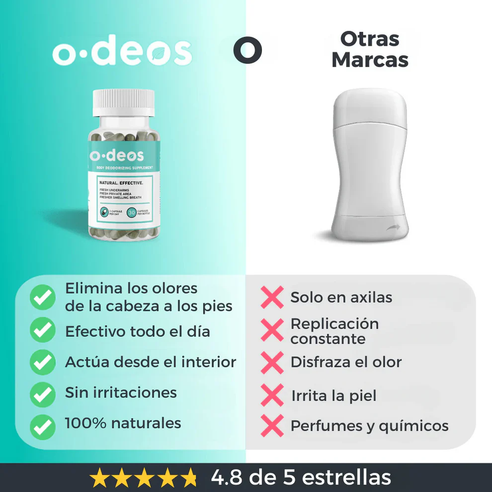 ODeos combate los olores corporales desde el interior, promoviendo una buena salud digestiva. Su fórmula natural ayuda a limpiar el cuerpo desde adentro, absorbiendo las toxinas en tu sistema antes de que se excreten a través de la piel y el aliento.